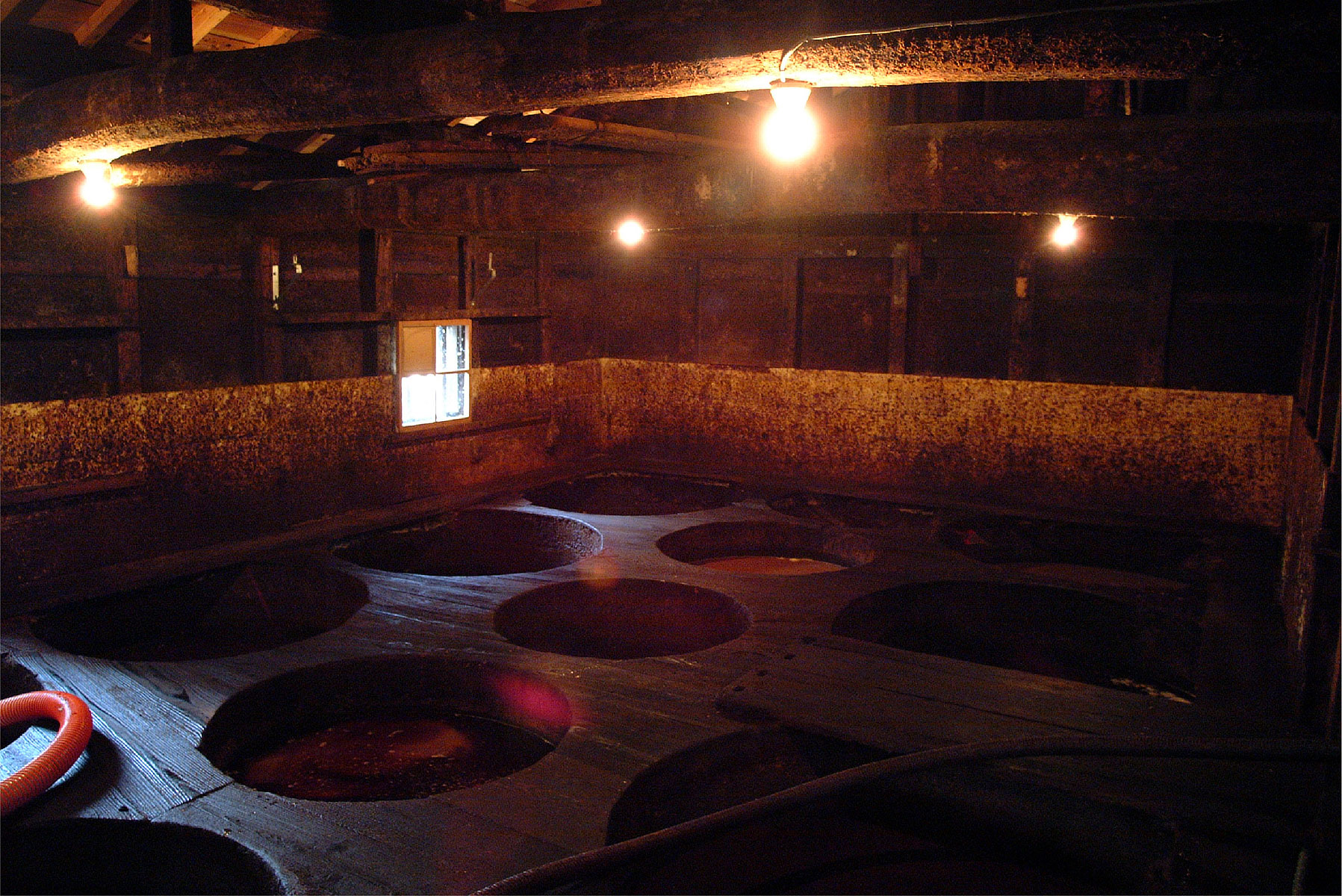 MaFaire la purée de moromi en ajoutant l’eau salée et le kōji dans les cuves en cèdre.